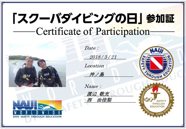 2018/05/21に体験ダイビングで参加された男女2名様の【スクーバダイビングの日デジタル参加証】が届きました|千葉県館山市の沖ノ島ダイビングサービスマリンスノー